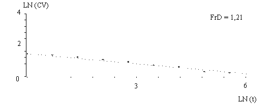 Используется временной ряд из N=2M отсчетов. На первом шаге из N=2M отсчетов вычисляется коэффициент вариации CV(1),% с использованием всех N значений временного ряда. Затем каждые 2 соседних отсчета усредняются и для вновь полученного временного ряда длиной N/2 вычисляется CV(2). На следующем шаге усредняются 2 отсчета из полученного на предыдущем шаге ряда длиной N/2 и вычисляется CV(3) и т. д. Данный процесс усреднения двух соседних отсчетов в пределах зерна укрупнения временной шкалы и расчета CV(i) для вновь модифицированного ряда производится M-1 раз до достижения ряда, состоящего только из 2 отсчетов, каждый из которых - результат усреднения первой или второй половины временного ряда. Затем строится в логарифмических шкалах график зависимости CV(i) от размера зерна укрупнения временной шкалы. Вычисляется тангенс угла наклона А(tgA) прямой регрессии для отмеченных точек оси X. Фрактальная размерность временного ряда FrD=1-tgA.