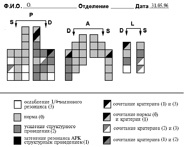 В качестве иллюстрации приводим случай пациента О., 42 года, который находился на лечении в стационаре с 28.05. по 26.06.96 г. с диагнозом: очаговая пневмония справа в нижней доле (8 сегмент) и в средней доле (4 и 5 сегменты), осложненная правосторонним экссудативным плевритом и острой сосудистой недостаточностью на фоне хронического катарального обструктивного бронхита в фазе ремиссии с дыхательной недостаточностью 1 степени.