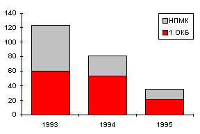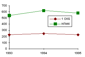 При рассмотрении данных, указанных в таблицах, отмечается стабильность количества пациентов с мочекаменной болезнью, поступавших в оба лечебных учреждения в период 1993-1995 гг., в то время как количество проведенных операций по поводу данной патологии в те же годы значительно различается. Причем, если в НПМК LЭкологическая медицина¦ резкое снижение количества операций произошло в 1994 году, то в 1 ОКБ это произошло в 1995 году. Мы объясняем этот факт пуском в эксплуатацию литотриптера. В НПМК LЭкологическая медицина¦ активное применение литотрипсии как метода лечения больных с мочекаменной болезнью активно начато с 1994 года, а приток больных из 1 ОКБ начался в 1995 году. Более наглядно данные о поступавших больных представлены на графике (рис. 1), количество выполненных операций - на рис. 2.