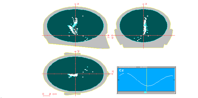 Обращает на себя внимание концентрация мощности медленных позитивно-негативных волн в области СZ и FZ. Используя методику вычисления дипольных источников этих волн, обнаружили их происхождение в глубинных структурах межполушарной области мозга (см. рис. 2), где расположены важнейшие центры восходящих влияний на активность мозга - ретикулярная формация среднего мозга, медиальные зоны таламуса, а также области, имеющие отношение к регуляторным процессам в зависимости от светового режима и репродукции - это, в основном, области, прилегающие к стенкам третьего желудочка, и эпифиз. Отмечается высокая концентрация этих источников по поперечной оси и рассеяние по вертикальной и передне-задней осям головы.