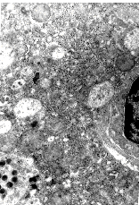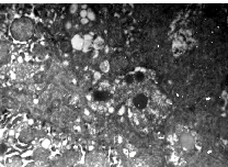 При изучении ткани печени на ультраструктурном уровне, у всех больных с персистенцией HBsAg обнаружены изменения субклеточных структур. В первую очередь изменениям были подвержены наиболее уязвимые ультраструктуры, ответственные за энергетический обмен и белковосинтетическую функцию. Характерными ультраструктурными изменениями гепатоцитов во всех случаях являлись гиперплазия и полиморфизм митохондрий, которые имели нечеткие, размытые кристы; гладкая и шероховатая эндоплазматическая сеть (ЭПС) резко гиперплазирована, расширена с формированием вакуолей и потерей рибосом. В матриксе содержится большое количество полисом и свободных рибосом (рис. 1). Значительные изменения митохондрий и ЭПС свидетельствуют о значительном нарушении энергообеспечения метаболических процессов, протекающих в гепатоцитах. На фоне указанных ультраструктурных изменений преобладало угнетение белковосинтетической функции. О чем свидетельствует наличие у этих больных биохимического синдрома гепатоцеллюлярной недостаточности. Наблюдалось снижение содержания альбуминов (70 2 г/л), альбумино-глобулиновый коэффициент составил менее 0,8 преимущественно за счет снижения альбуминов, а при наличии хронического активного гепатита (ХАГ) - и за счет повышения содержания глобулиновой фракции. Угнетение белковосинтетической функции коррелировало с тяжестью ультраструктурных изменений: от незначительного снижения альбуминов на фоне слабо выраженных дистрофических изменений до выраженной гипоальбуминемии в сочетании c гипофибринемией при тяжелых ультраструктурных изменениях, обусловленных хроническим активным гепатитом и циррозом печени вирусной этиологии. У 3 больных с морфологическими диагнозами ХАГ и ЦП наблюдался геморрагический синдром, обусловленный снижением синтеза в печени коагулянтов и, в первую очередь, фибриногена (1,85 0,5 г/л).