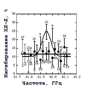 Исследование действия непрерывного ЭМИ КВЧ в узком частотном диапазоне (41,75-42,15 ГГц) на реакцию синергизма кальциевого ионофора А23187 и ФМА в нейтрофилах показало высокую селективность систем связанных биохимических реакций, участвующих в активации респираторного взрыва, к несущей частоте излучения (рис. 4). При несущей частоте излучения 41,95 ГГц обнаружено максимальное ингибирование синергической реакции - около 25%, достоверно отличающееся от эффекта ЭМИ КВЧ для других несущих частот. ПППЭ в этой серии экспериментов была около 50 мкВт/см2. Величина эффекта слабо зависела от ПППЭ и при ПППЭ от 20 до 150 мкВт/см2 в среднем составляла около 24%.