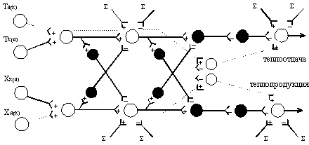 Как отмечалось нами ранее [5, 18], контролируемые этими влияниями процессы являются по функциональному назначению трофическими и они служат цели подготовки пейсмекеров к повышению активности. В соответствии с заложенной природой программой, требующей при совершении работы соблюдение принципа экономии, такое изменение активности пейсмекеров должно развиваться вначале преимущественно под влиянием сигналов, идущих по растормаживающим путям. Применительно к рассматриваемой в данной работе более узкой проблеме центров системной регуляции процессов теплообмена можно предположить, что при последовательном изменении кожной, а затем внутренней температуры, возрастает влияние возбуждающих входов. Такая последовательность включения входов соответствует принципам работы всей системы Lпо возмущению¦ и Lпо отклонению¦.