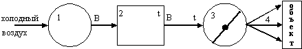 Исходя из этого, была разработана специальная установка для локального тепловоздушного воздействия (LТеплотрон¦) по методике предложенной К.В.Судаковым. Принципиальная блок-схема установки приведена на рис. 1. Нагнетающий воздушный вентилятор (1) через воздуховоды (в) направляет холодный воздух в блок нагрева воздушной массы (2) с применением теплоэлектрических нагревателей. Затем теплый воздух, проходя через регулируемую воздушную заслонку (3), подается в выходящую трубу (4), положение которой можно менять в зависимости от задачи эксперимента. Таким образом на выходе из установки получали пульсирующий или непрерывный поток воздуха, который направлялся на любые участки тела испытуемого. Сконструированная подобным образом установка LТеплотрон¦ позволяет: