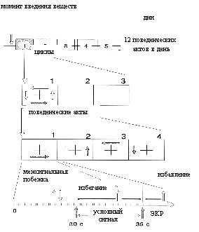 Обучение крыс активно оборонительному поведению проводилось с помощью автоматизированного комплекса, включающего 4-камерный лабиринт на базе OPTO-VARIMEX и ЭВМ LApple-II¦, осуществляющего управление и обработку сигналов. Схема проведения эксперимента показана на рис. 1. Изучаемые вещества и физиологический раствор или дистиллированная вода, в соответствующих объемах и способах введения (в контрольных группах), вводились непосредственно перед первым сеансом обучения.