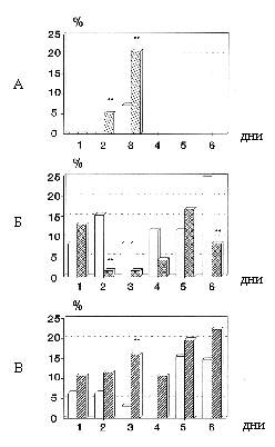 В процессе обучения у всех крыс наблюдались межсигнальные побежки (МСП) в неосвещенные отсеки с электрокожным подкреплением до подачи условного сигнала. Среднее количество МСП за весь период обучения достоверно не различалось по группам. Анализ динамики взаимосвязи межсигнальной активности с последующей результативностью в этих циклах позволил обнаружить следующие факты. В контрольной группе животных (рис. 3А) в первые три дня обучения МСП равновероятно встречались как в ошибочных, так и в результативных поведенческих актах. Однако с 4-го дня происходило возрастание числа МСП и достоверно (p<0,05) более высокая их корреляция с правильным выполнением оборонительного акта.