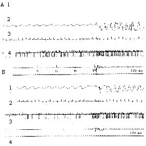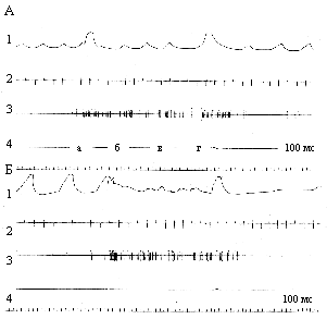 (А) и при межсигнальной активности (Б). Обозначения - как на