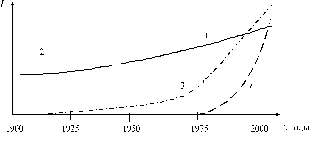 где функциональная зависимость адаптации А от нормы N является многопараметрической и выраженной нелинейной. Во-первых, как следует из (1), адаптация и норма являются функциями от параметров tэв и tэв соответственно - параметров "эволюционного времени". Сами по себе эти параметры нельзя отождествлять с физическим временем t; это, скорее всего, историческое время, которое, в отличие от времени физического, не обладает качеством равномерности (эквидистантности). В интересующем нас аспекте, то есть при воздействии электромагнитного излучения крайневысоких частот (ЭМИ КВЧ) на организм человека, можно выделить два периода: долгосрочный, относящийся к эпохе клеточной организации жизни на Земле и ее развитию в простых формах организации животных, и краткосрочный - фактически XX век, когда возросла роль техногенных факторов.