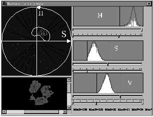 Предварительные исследования изображений, поступающих на вход системы, показали, что изображение может быть сегментировано по цветовым признакам. Эксперименты проводились с помощью специально разработанного программного модуля, позволяющего выделять в цветовом пространстве HSV области, ограниченные плоскостями, перпендикулярными осям цветовых координат. Пикселы изображения, цвет которых не входит в выделенную область, окрашиваются в черный цвет. Изменяя границы области удалось выделить множества цветов, соответствующих фону, ядрам лейкоцитов, цитоплазме лейкоцитов и эритроцитов. На рис. 2 приведены гистограммы всего изображения, а на рис. 3 - гистограммы ядра лейкоцита.