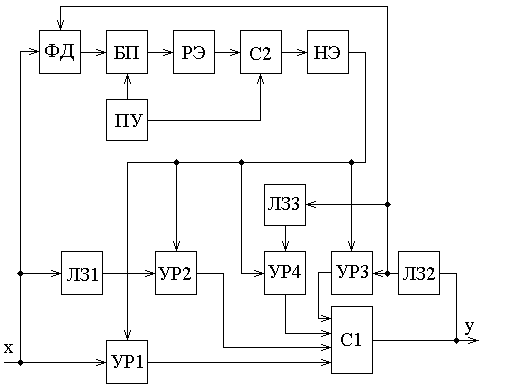 Полосовой фильтр реализован на сумматоре С1, линиях задержки ЛЗ1-ЛЗ3 и усилителях с регулируемым коэффициентом усиления УР1-УР4. Выходной сигнал Y полосового фильтра образуется на выходе сумматора С1 как сумма выходных сигнало в УР1-УР4, причем УР1 и УР2 стоят в цепи входного сигнала X, а УР3 и УР4 - в цепи обратной связи. Управляющие входы УР1-УР4 соединены с выходом нелинейного элемента НЭ, который является ограничителем диапазона изменения резонансной частоты полосов ого фильтра. На вход НЭ подается выходной сигнал сумматора С2, на входы которого поступают сигналы с регулирующего элемента РЭ и программного устройства ПУ. Блок переключения БП по сигналу с ПУ подает на вход РЭ либо нулевой сигнал (до времени начала ре гулирования tp), либо выходной сигнал фазового детектора ФД. Входной сигнал X (зарегистрированный ВП) поступает на входы УР1, ЛЗ1, ФД. После прохождения сигнала Y через ЛЗ2 на выходе ФД появляется сигнал, постоянная составляющая которого пропорциональна фазовому сдвигу выходного сигнала относительно входного. РЭ, выполненный на основе интегрирующего звена, выдает нарастающий сигнал, пропорционально которому резонансная частота полосового фильтра изменяется в сторон у увеличения (уменьшения) до тех пор, пока не совпадет с частотой входного сигнала. В этом случае фазовый сдвиг станет равным нулю, и процесс настройки прекратится. ПУ выполняет две функции - реализует задержку начала регулирования, обусловленную подачей стимула в ненулевой момент времени, и задает начальную резонансную частоту полосового фильтра. При необходимости может быть задан закон программного изменения резонансной частоты, что может улучшить качество переходного процесса настройки.