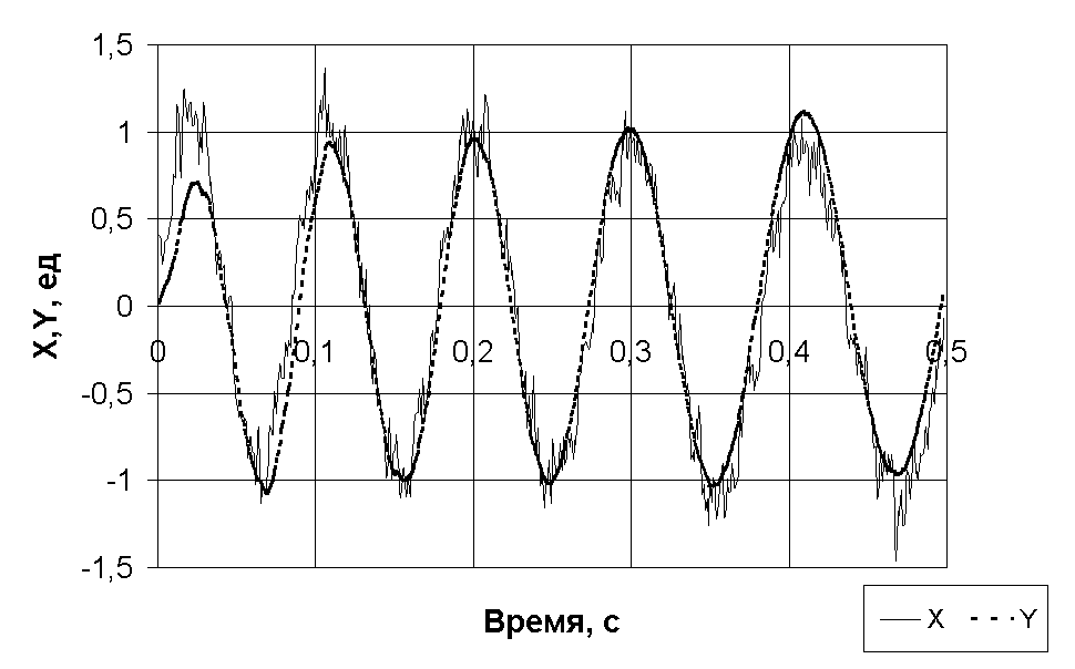 Рис.3. Процесс обработки тестового сигнала переменной частоты