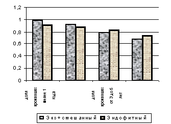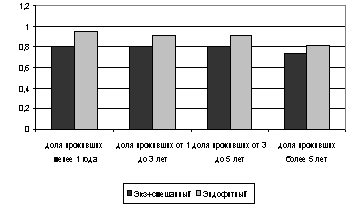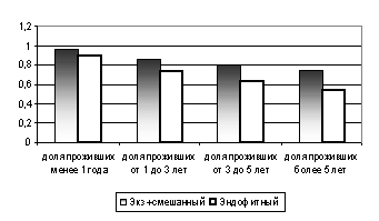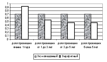 летальность (рис. 3) почти не зависит от характера роста опухоли, доля больных, проживших более года с эндофитным